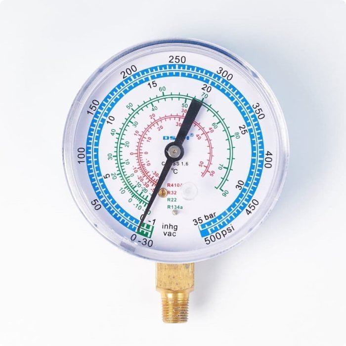 Корпус мановакуумметра изготовлен из окрашенной методом порошковой окраски в синий цвет стали. На шкалу нанесены температурные шкалы R22, R32, R134, R410A.